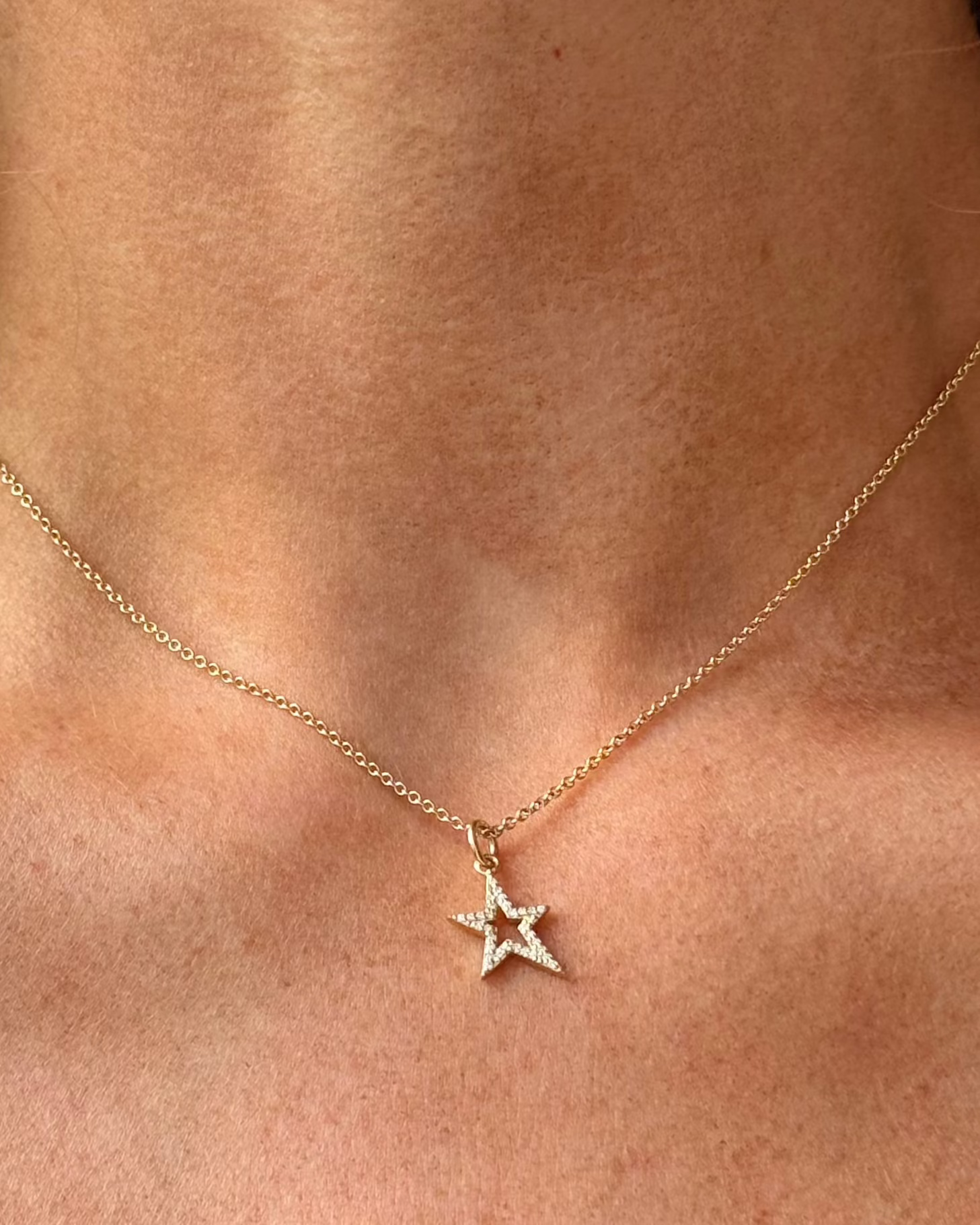 OUR ARI Gold Diamond Necklace is a radiant blend of elegance and symbolism. Crafted in 14kt yellow gold, this necklace features a diamond-studded ARI Star charm, adding a celestial touch to your jewelry collection. Designed with a 16" chain and a ½" drop, it sits beautifully on the neckline, perfect for layering or wearing solo.