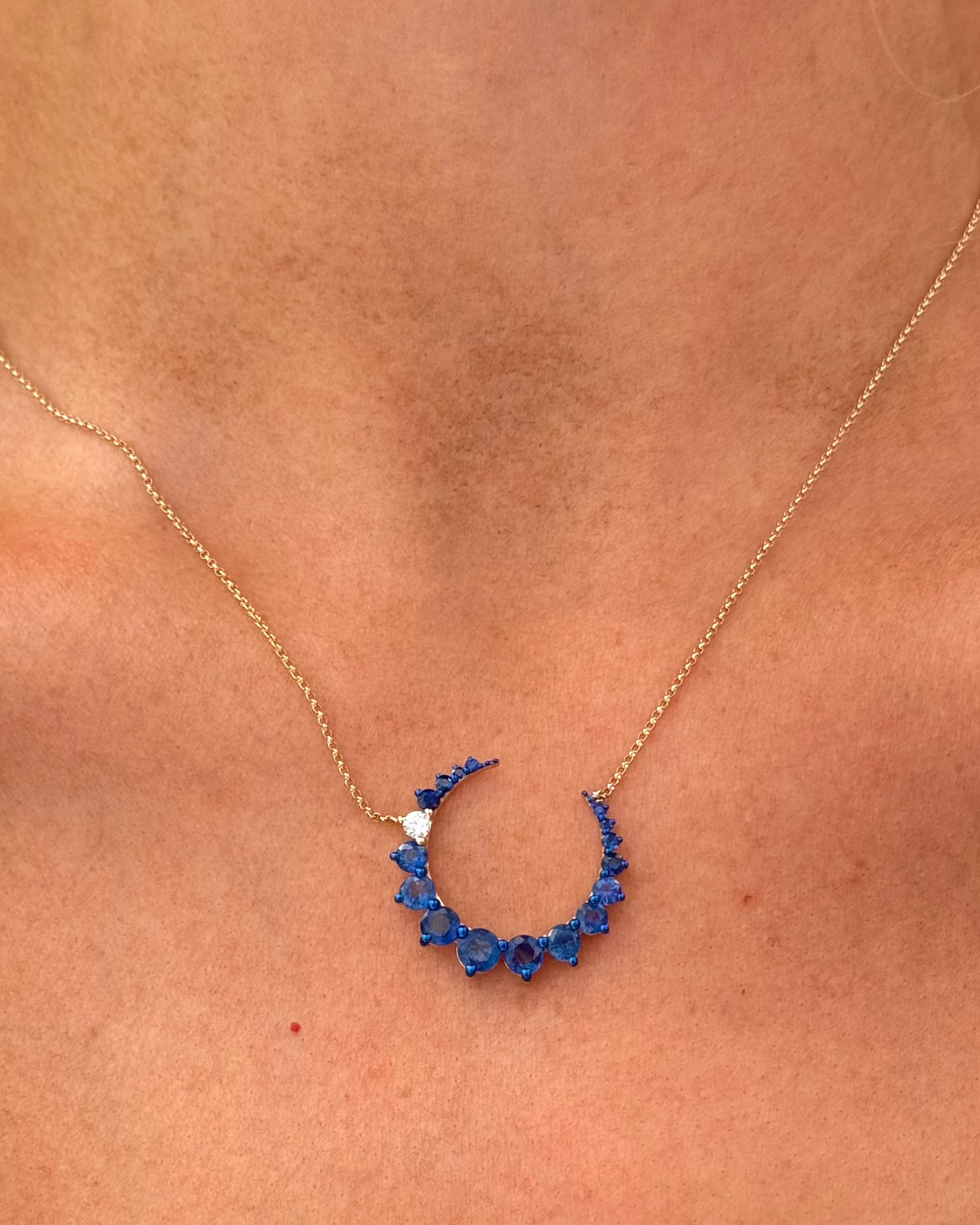 Our BROOKE Sapphire Diamond Necklace is vibrant, elegant, and designed to captivate. Crafted in 14kt yellow gold with rich blue sapphires and sparkling diamonds, this 1" x 1" pendant is enhanced with a sophisticated blue rhodium finish that adds depth and shine. A striking statement piece, BROOKE blends timeless luxury with bold color.