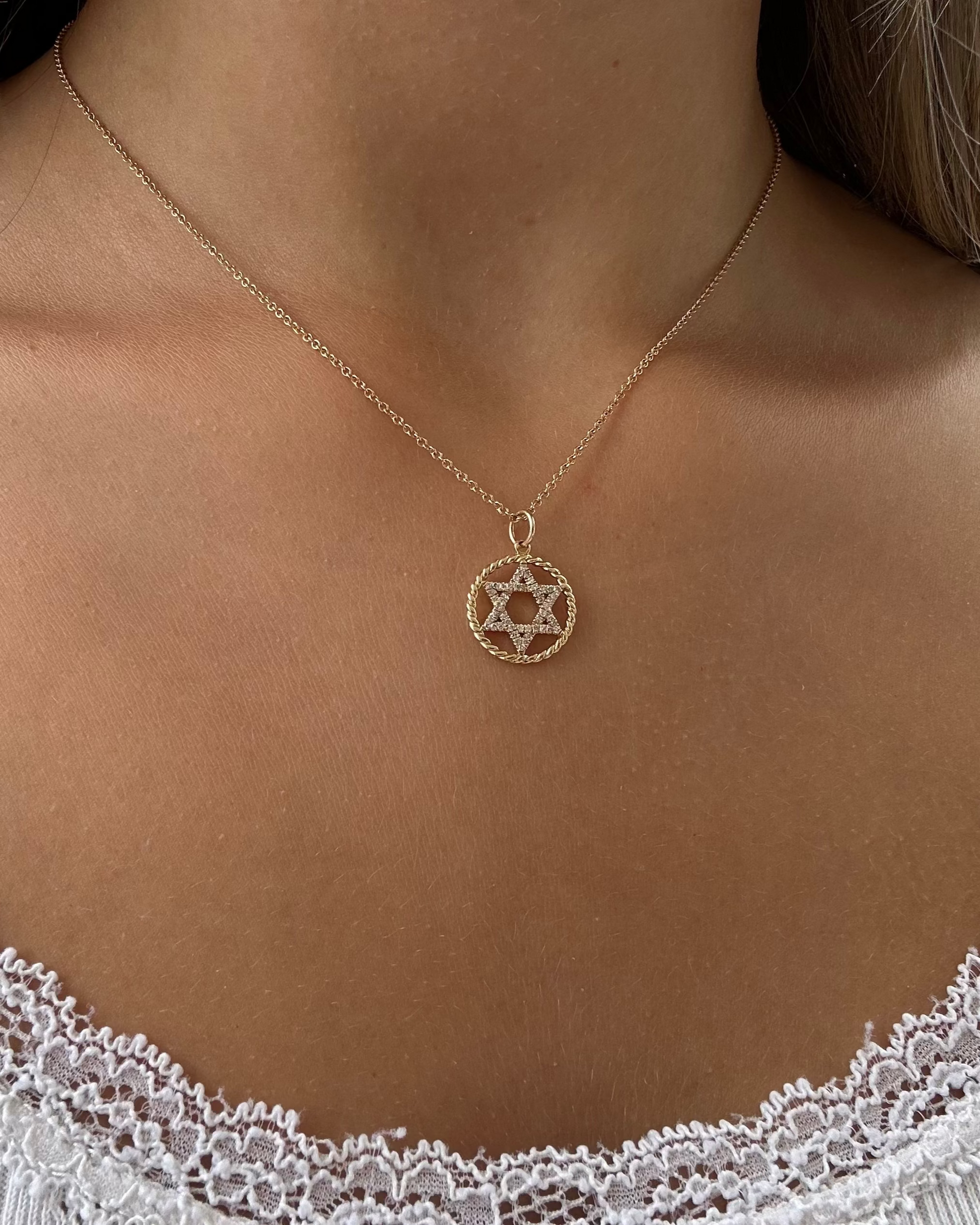 - Diamond-accented Jewish Star encased in a gold circle for a unique touch