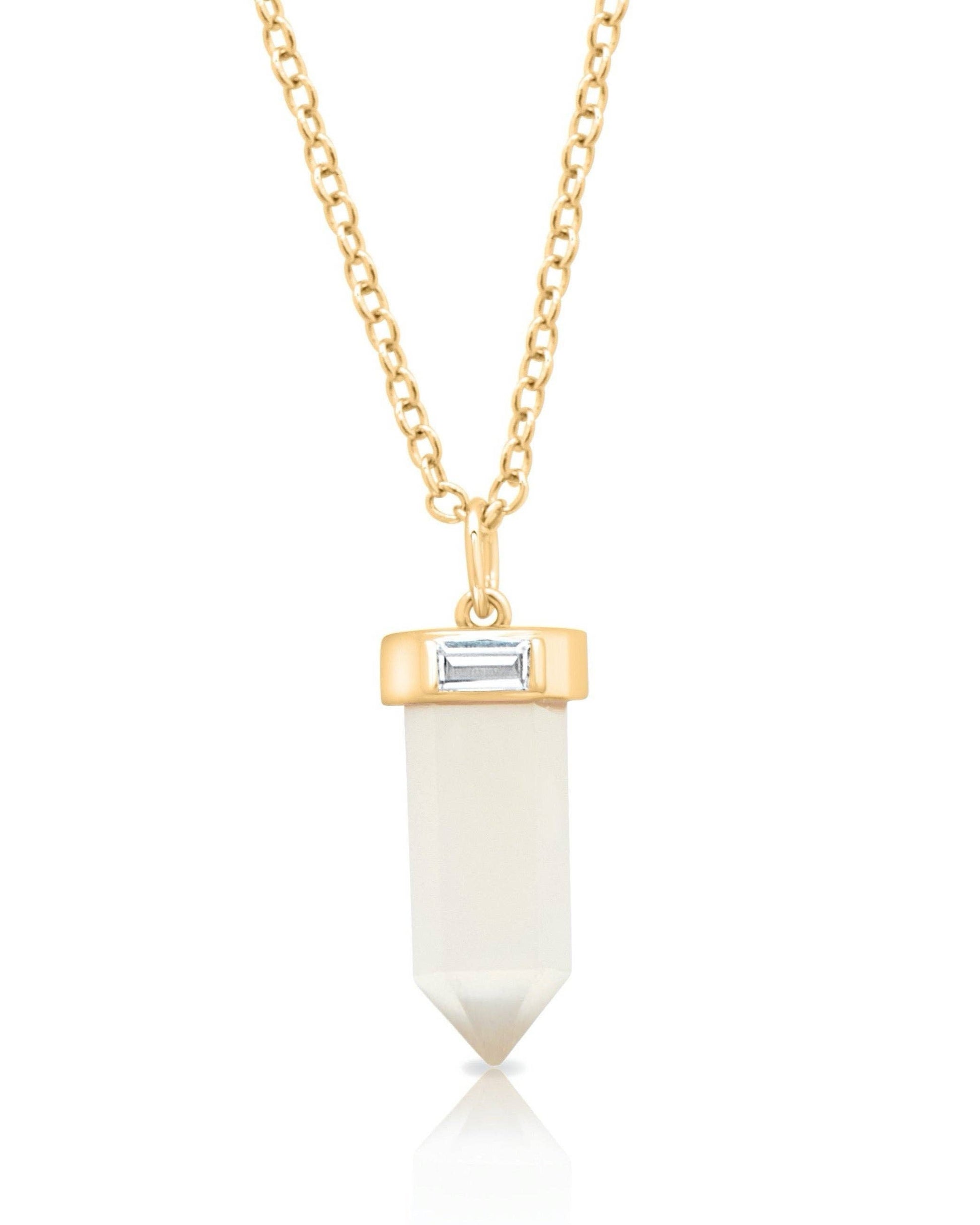 The Elizabeth Stone Stardust Crystal Pendant in White Cat’s Eye is radiant, refined, and made to glow with quiet glamour. This shimmering piece features a bezel-set white cat’s eye crystal with a sparkling cubic zirconia baguette accent—elegantly suspended from a 14k gold-plated chain. At 16" with a 2" extender, it layers beautifully or shines solo as a delicate statement.
